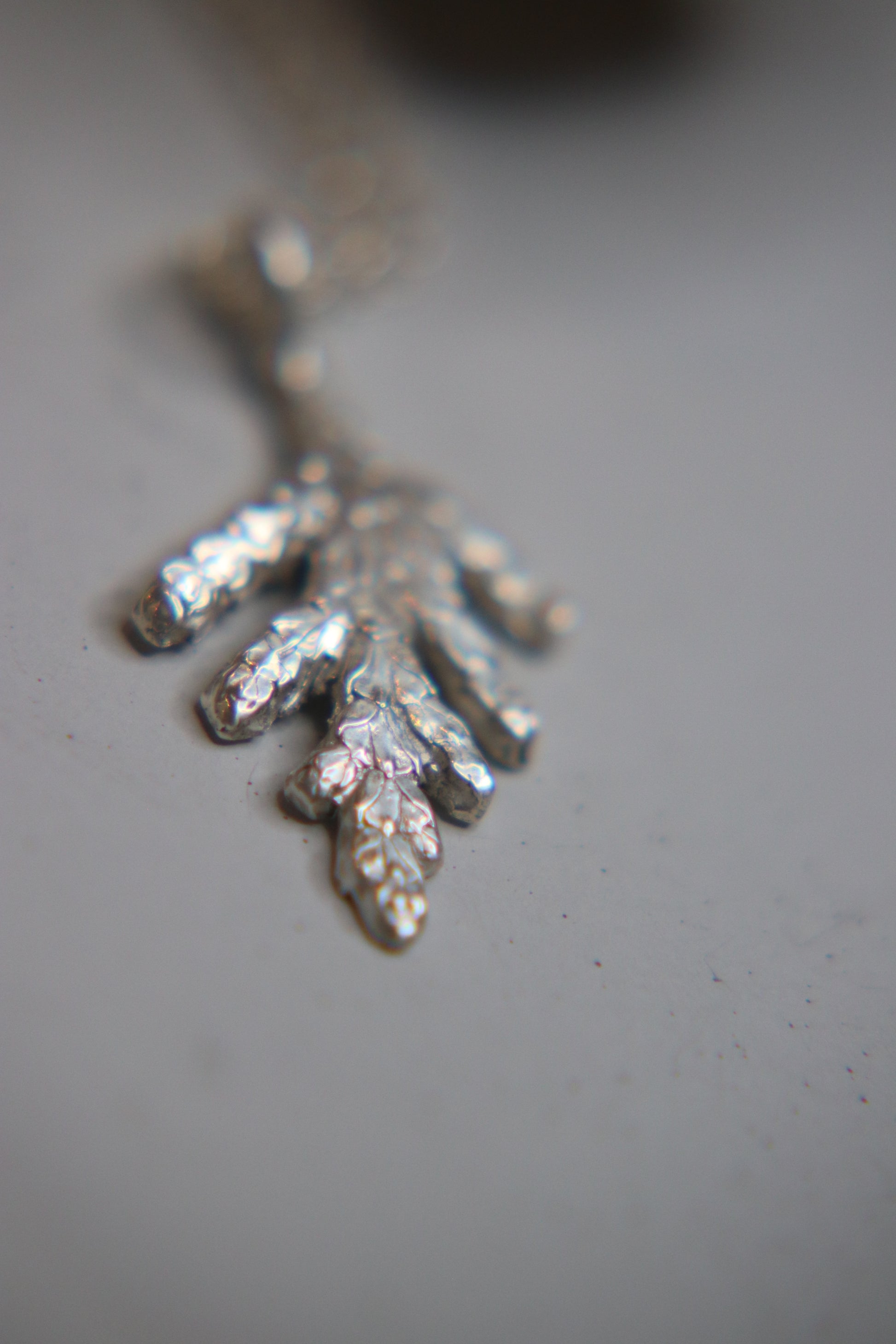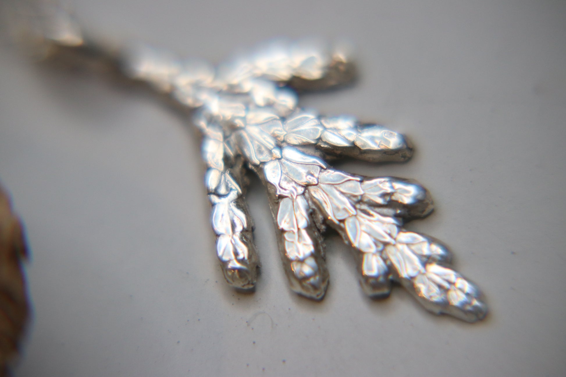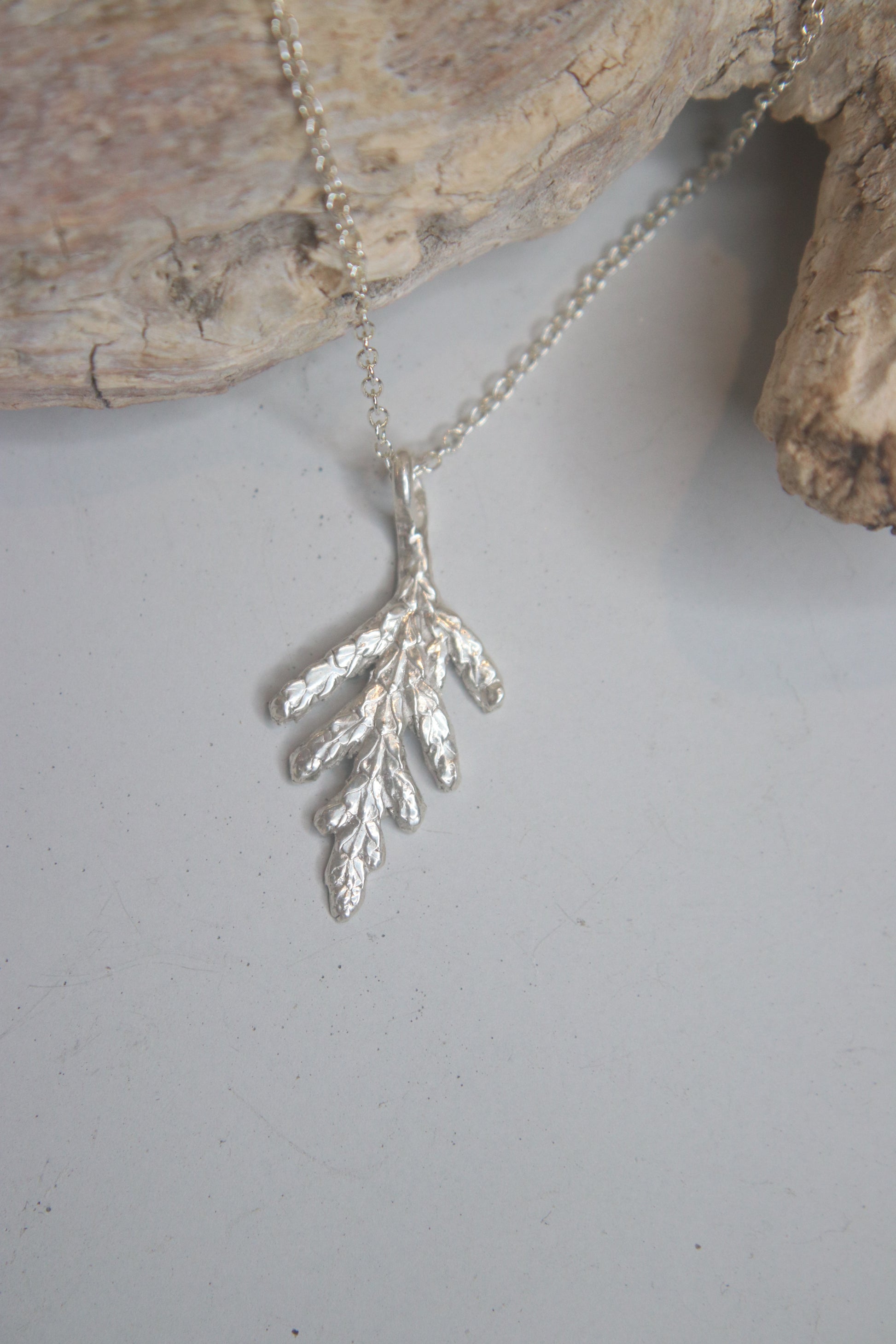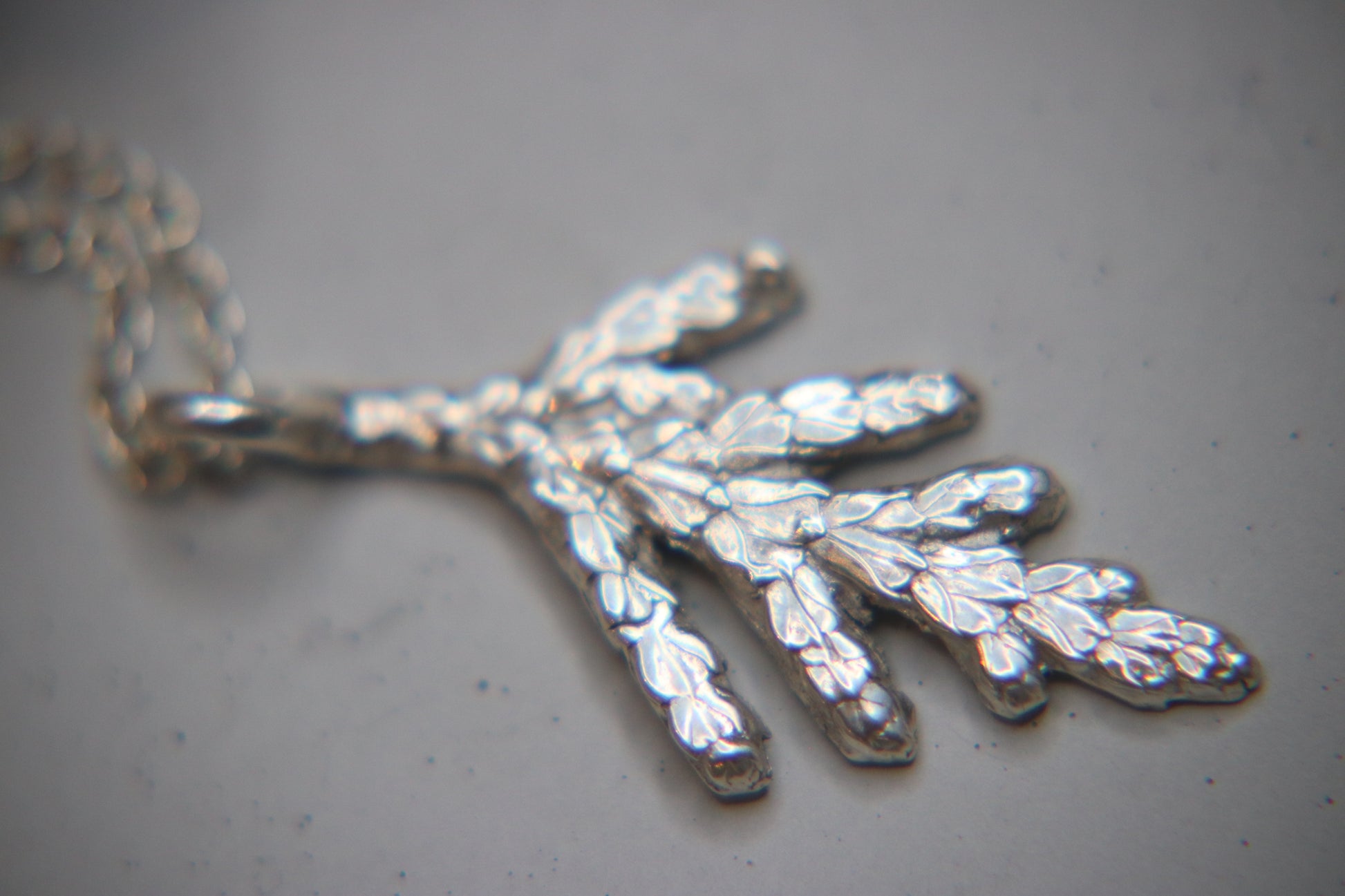 This silver clay pendant is made from an arborvitae hand cast, fired and polished to a beautiful shine. It comes with a sterling silver chain measuring 20” in total.