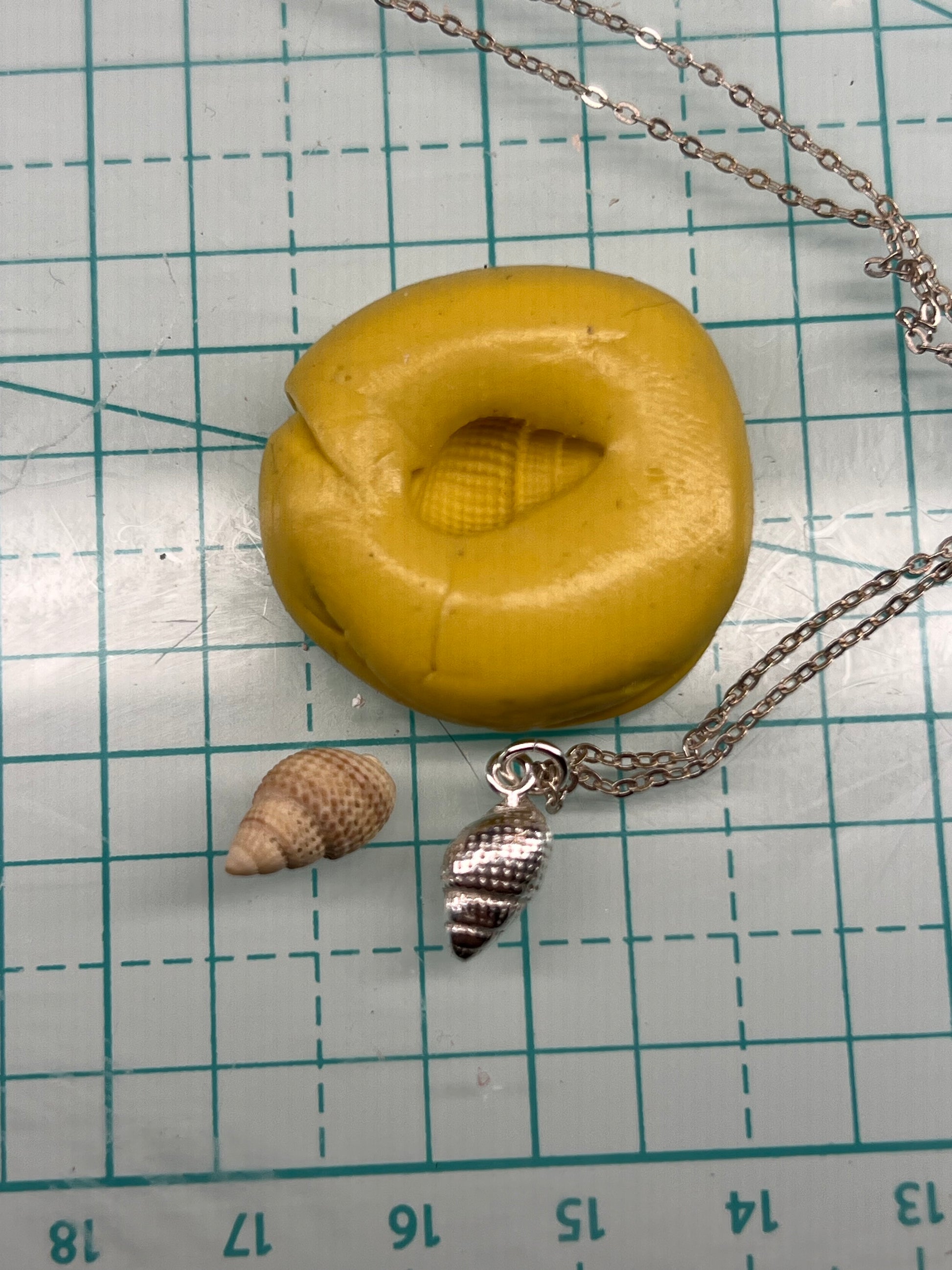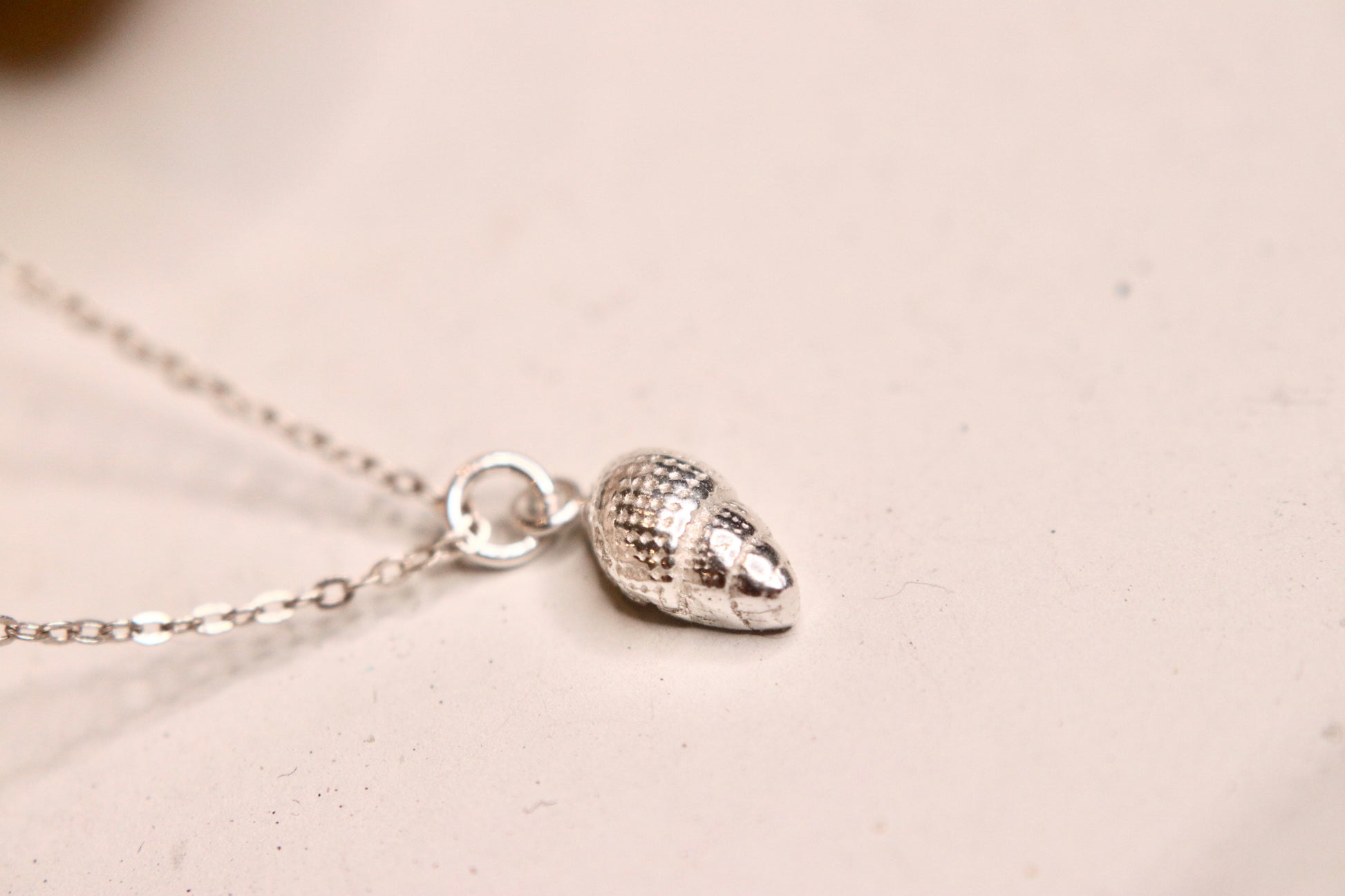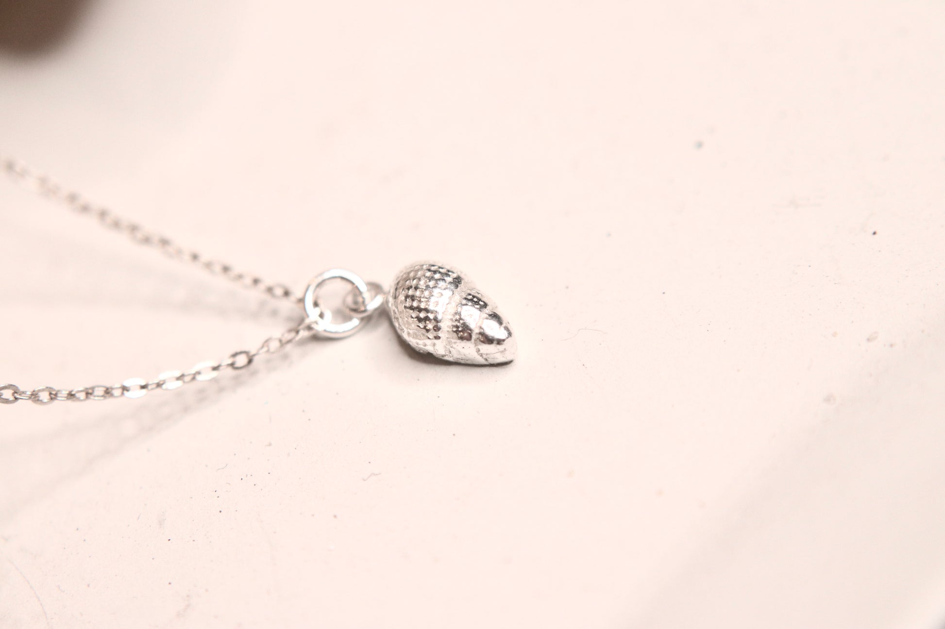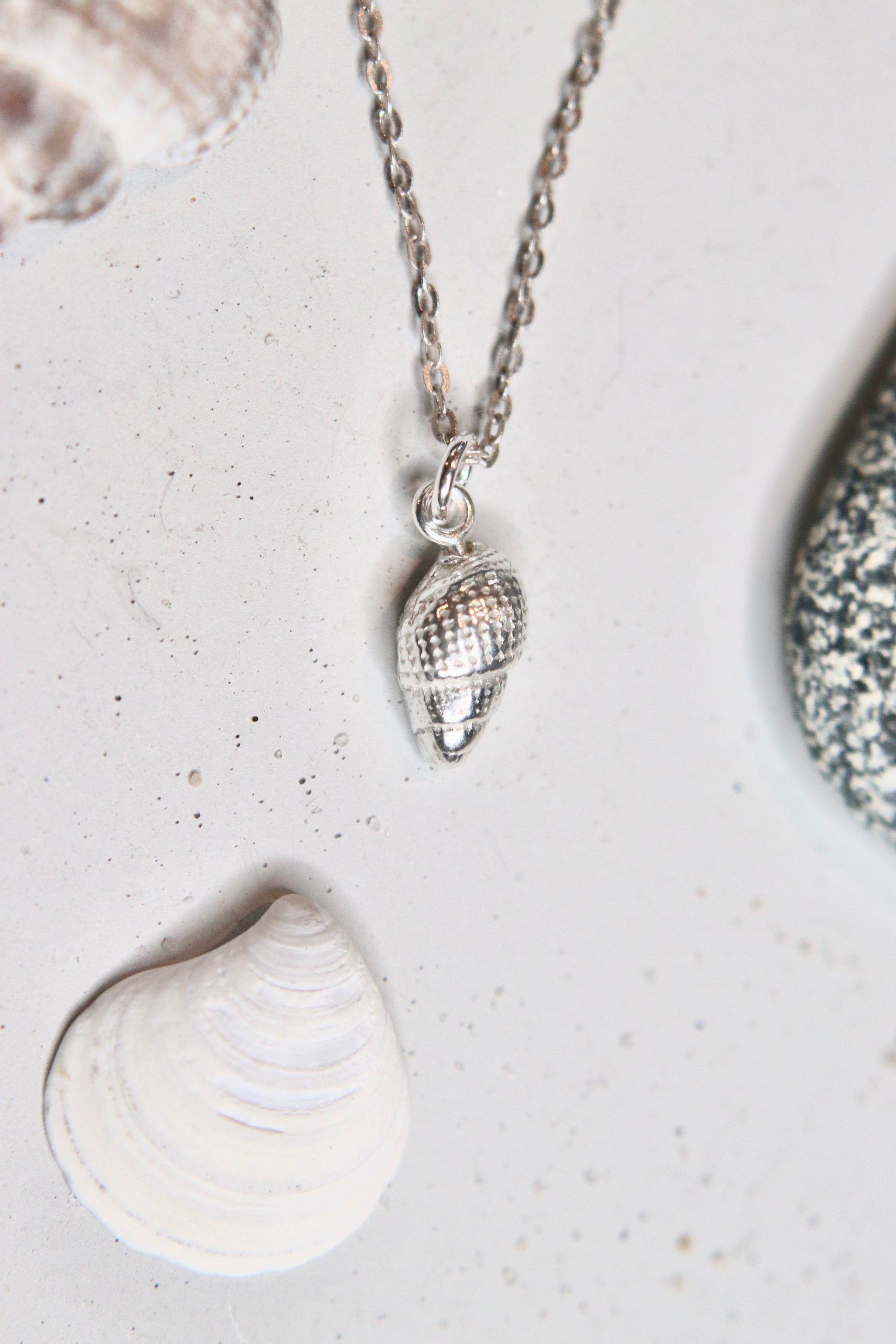 This adorable little shell necklace is made from pure .999 silver and comes with a 16” flat oval, .925 sterling silver chain. The shell was handmade from silver clay, fired and polished to a beautiful shine.