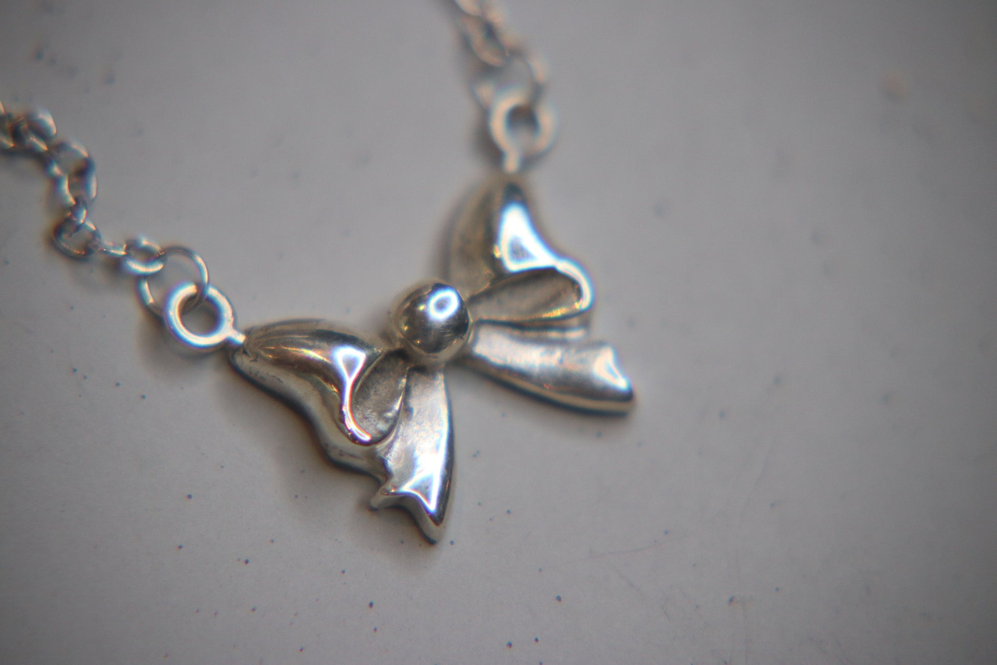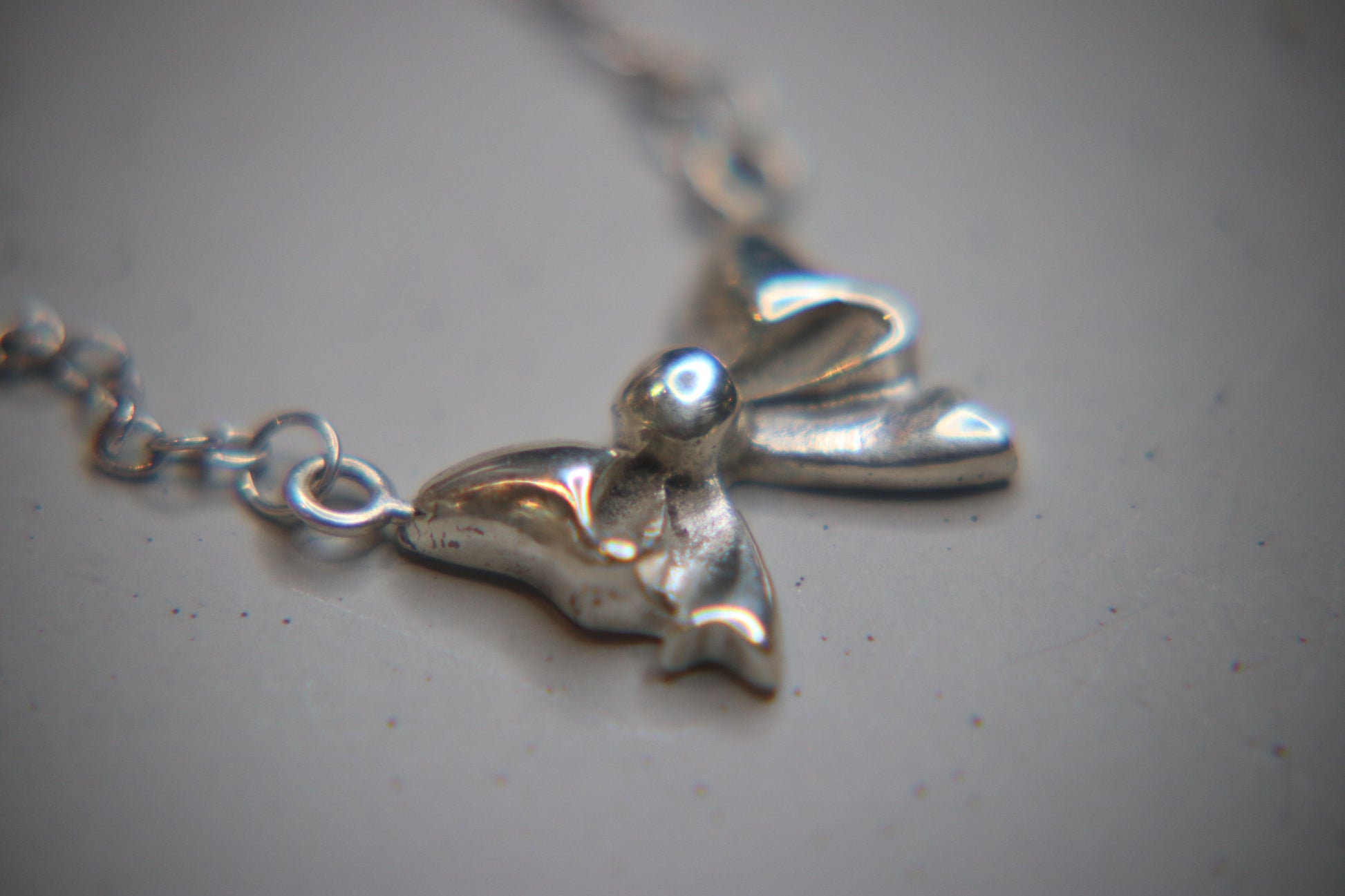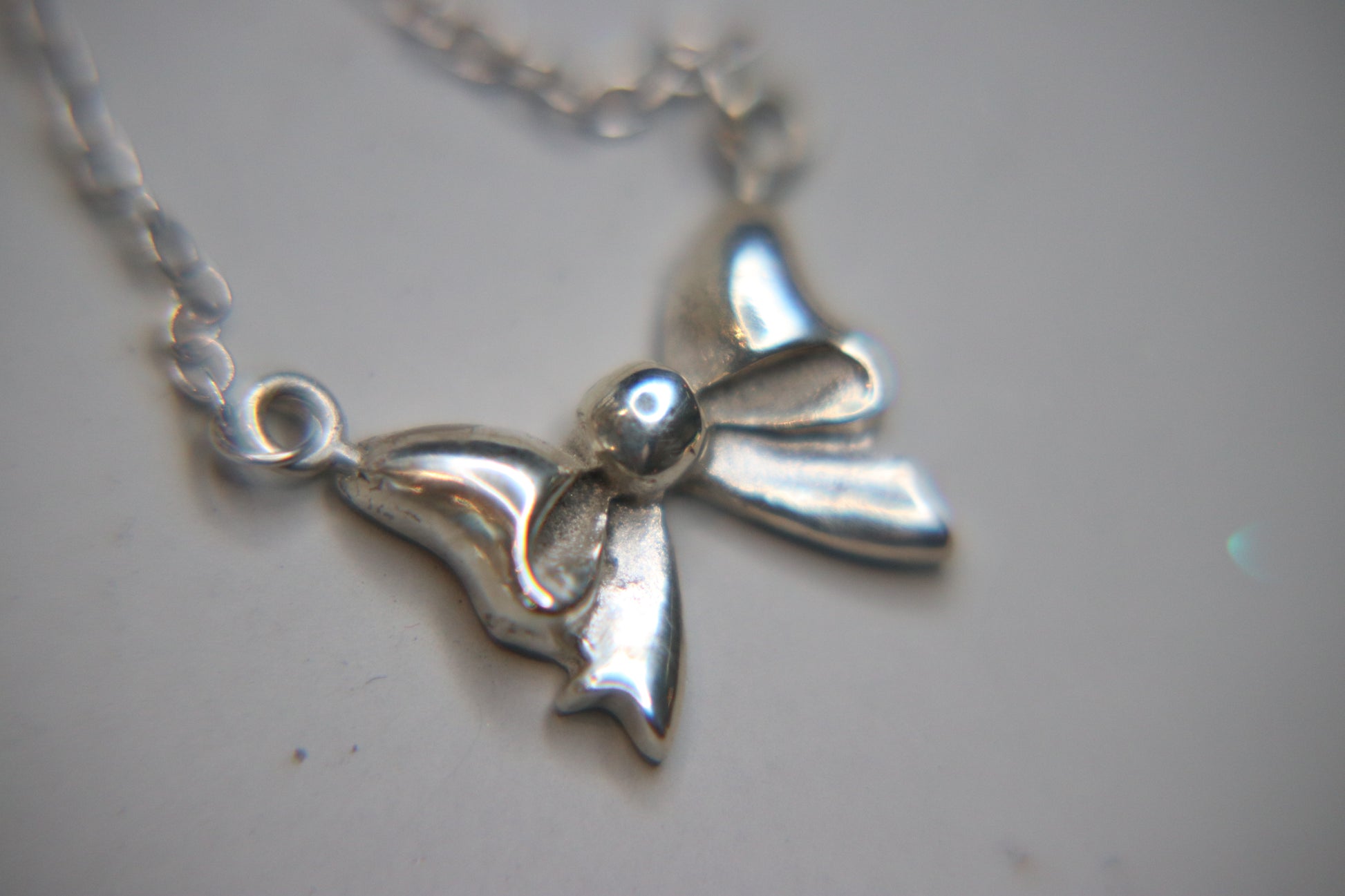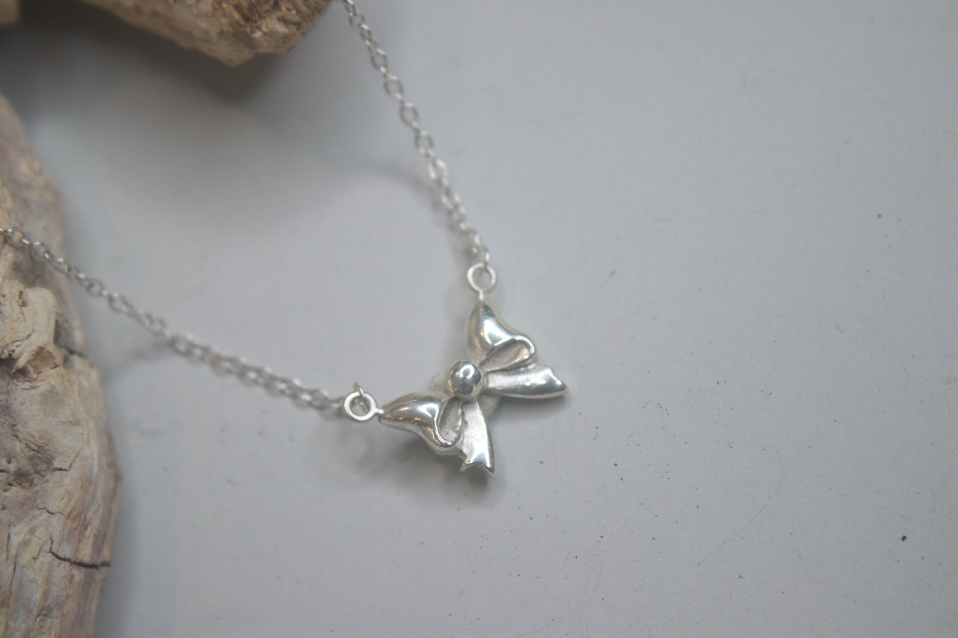 This cute little bow pendant is handmade from silver clay, fired and polished to a beautiful shine. It comes with a sterling silver chain measuring 18” in total.